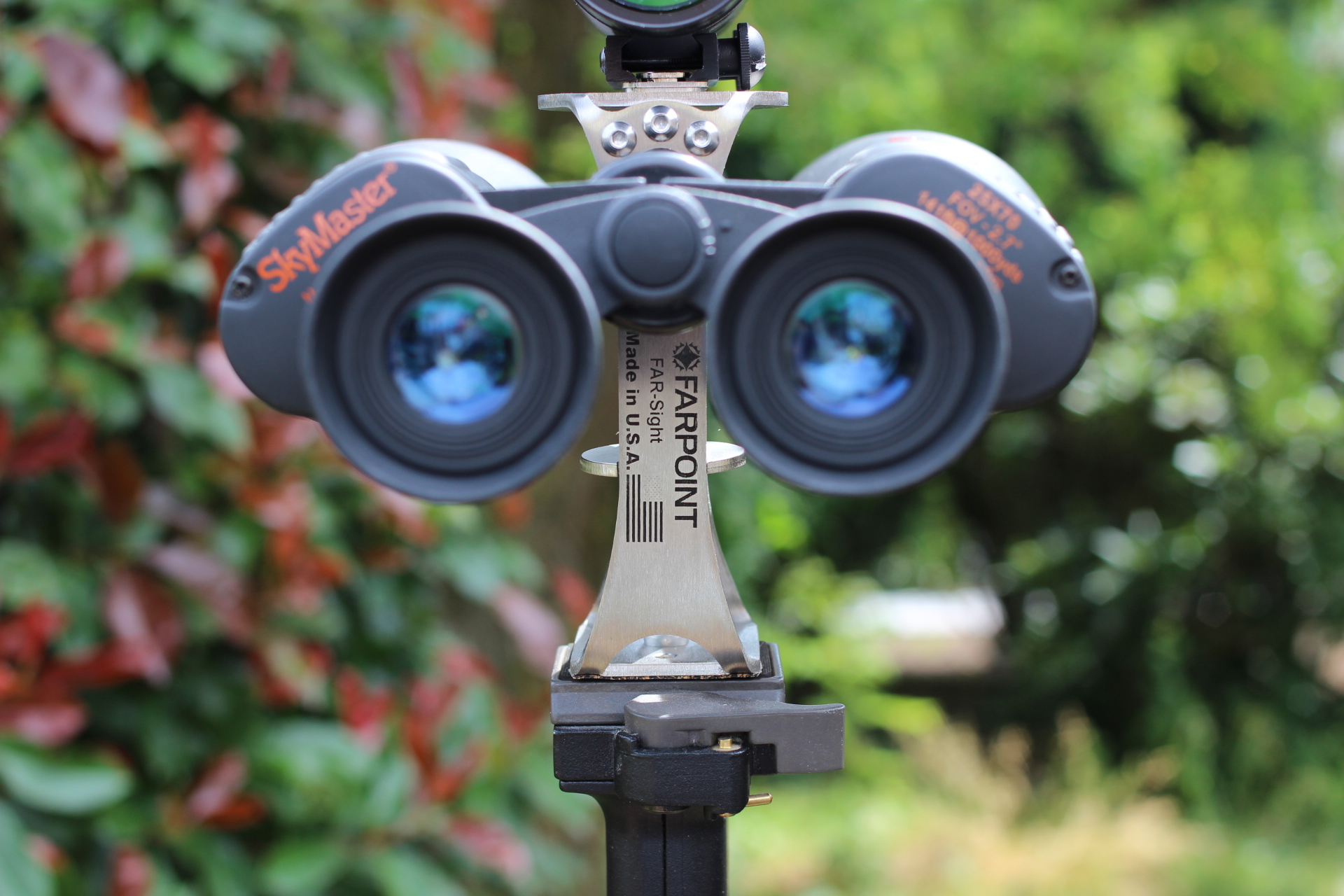 Pluspunkte sind das weitwinklige Bild mit 67° scheinbarem Gesichtsfeld und das vergleichsweise geringe Gewicht von knapp unter 1,5Kg. Den originalen Stativadapter haben wir durch den sehr guten FAR-Sight Fernglashalter der Firma Farpoint ersetzt. Der FAR-Sight Fernglashalter trägt das Celestron Skymaster sehr gut und ist auch mit der relativ hohen Vergrößerung von 25fach nicht überfordert. Der originale Stativadapter gehört ebenfalls zum Lieferumfang ist aber für dieses Fernglas praktisch unbrauchbar.