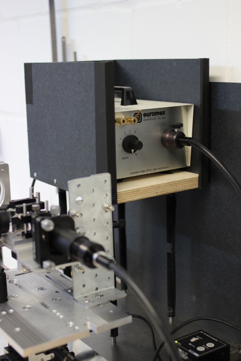 Die Beleuchtungseinheit sitzt auf einem Optikhalter der in 3 Richtungen linear bewegt und um zwei Ebenen gekippt werden kann. Damit wird eine exakte Ausrichtung des Beleuchtungsstrahls zum Interferometeraufbau möglich.