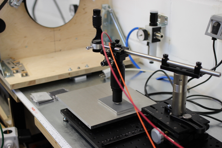 Die genaue Ausrichtung der Sonde zum Prüfung wird mittels Laserkollimator und verstellbarer Halterplattform sichergestellt. Der Laserkollimator ist vertikal genau zur Sonde ausgerichtet. Durch die Abbildung des vom Prüfling reflektierten Laserpunktes auf dem Lasertarget und Verkippung der Anordung mit den Verstellschrauben der Halterplattform können Prüfling und Sonde genau senkrecht zueinander ausgerichtet werden.