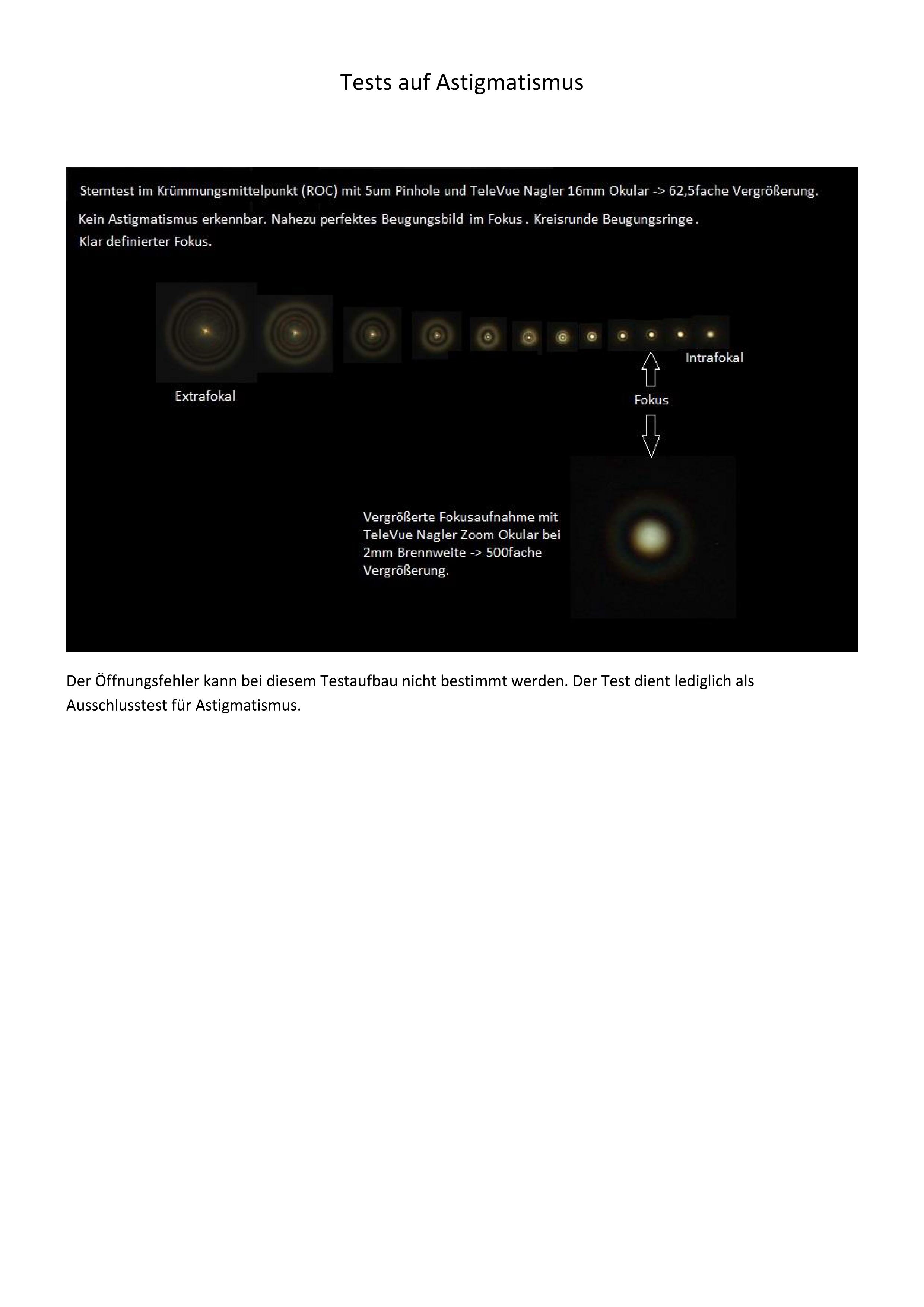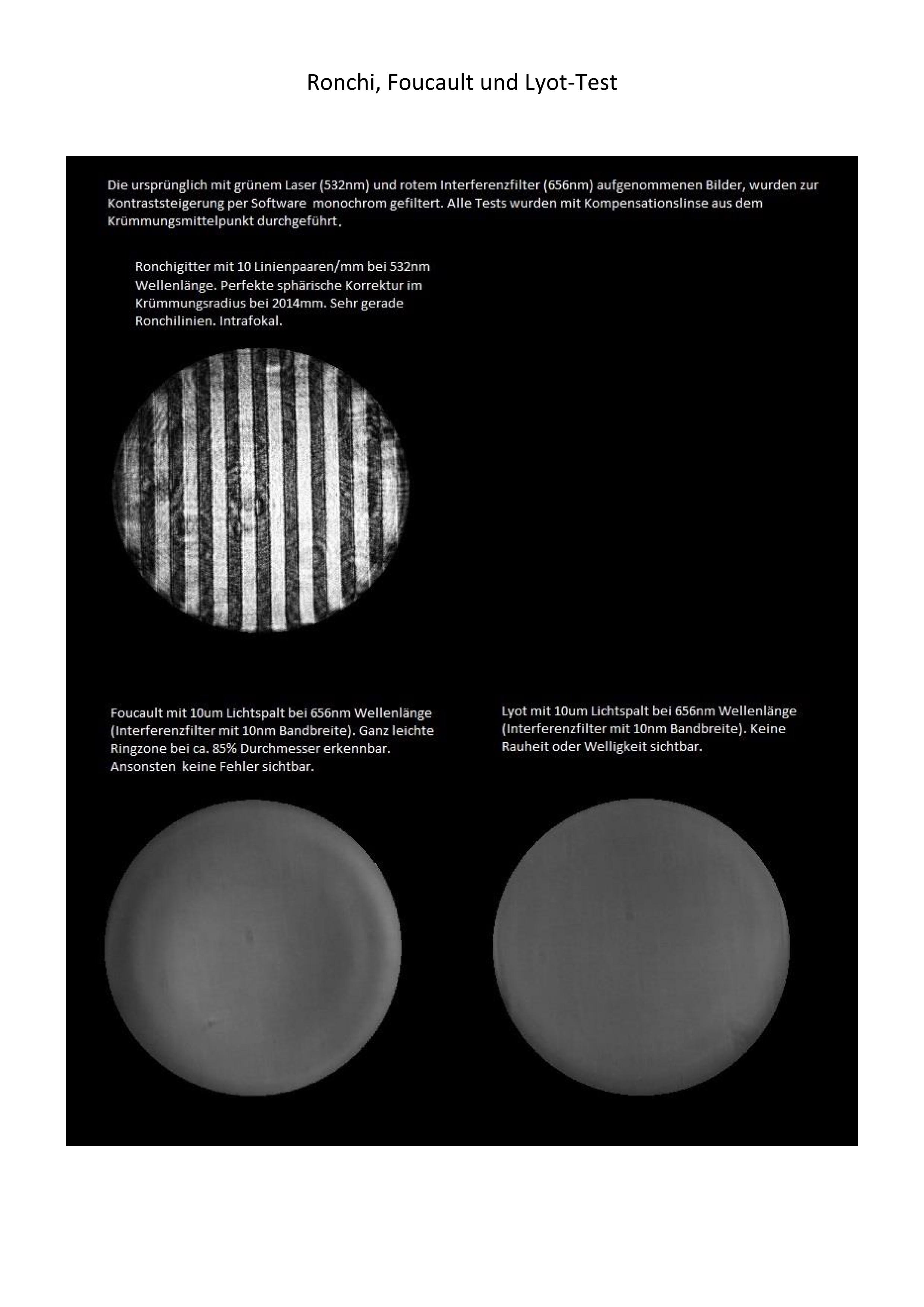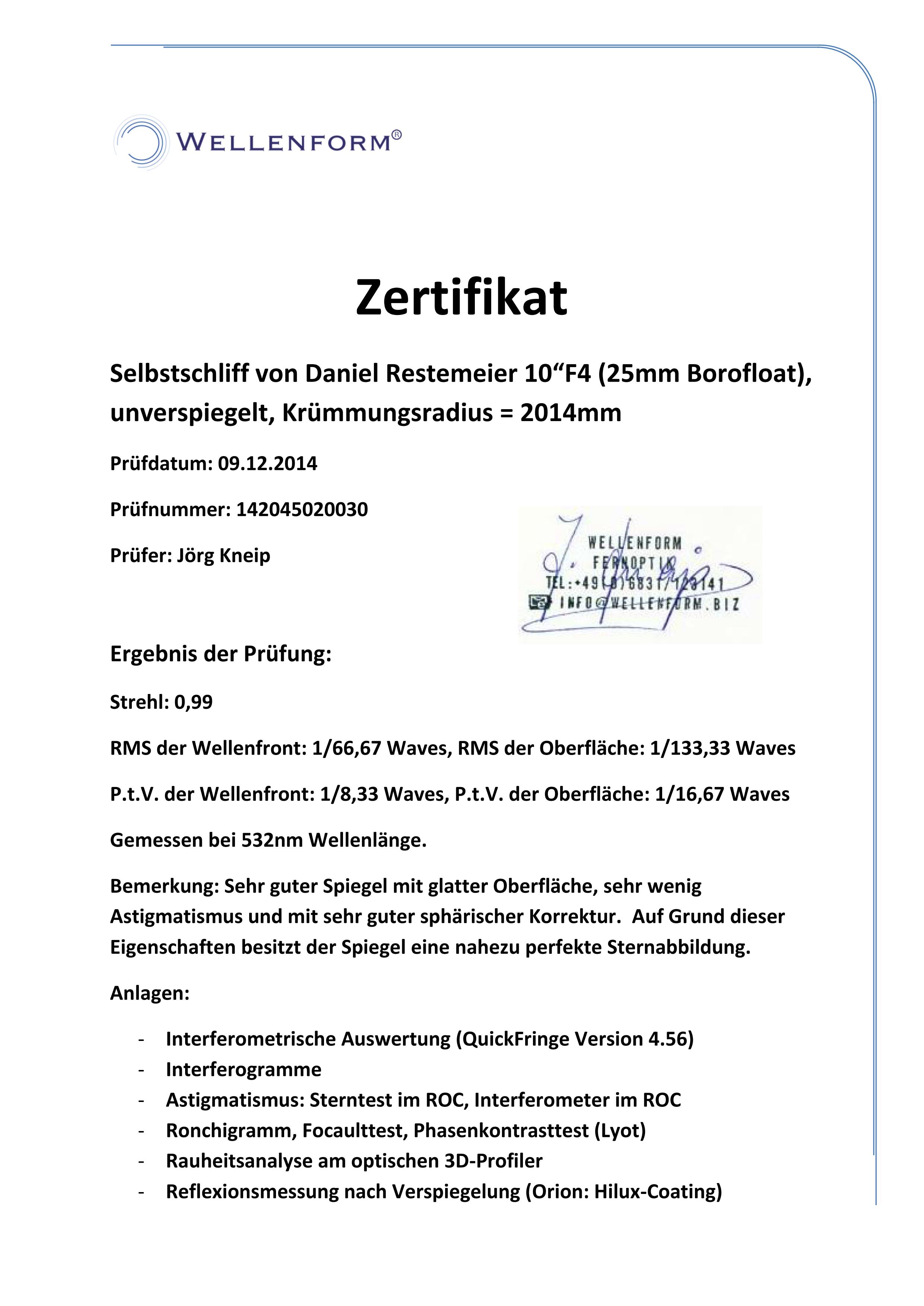 Wie man auf den Zertifikatsseiten in der Bildergalerie sehen kann, besitzt die Optik eine außerordentlich gute Qualität und kann durch die kurze Brennweite von 1007mm in allen Bereichen der astronomischen Beobachtung oder auch der Astrofotografie eingesetzt werden.