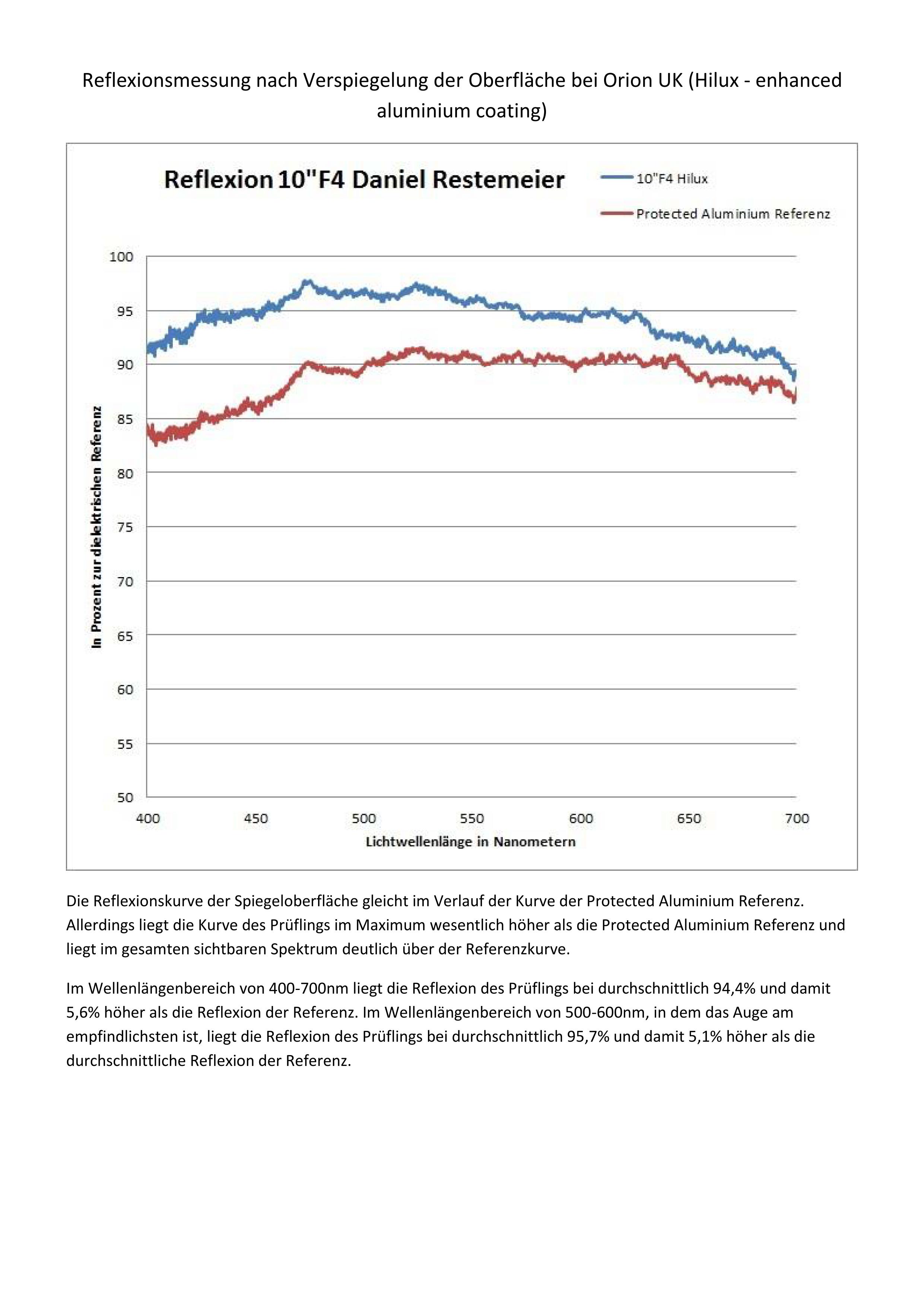 Der Spiegel wurde kürzlich mit einer erweiterten Aluminiumbeschichtung professionell belegt. Die Reflexion liegt im Wellenlängenbereich 400-700nm bei durchschnittlich 94,4% und steigt in der Spitze bis über 97% an.