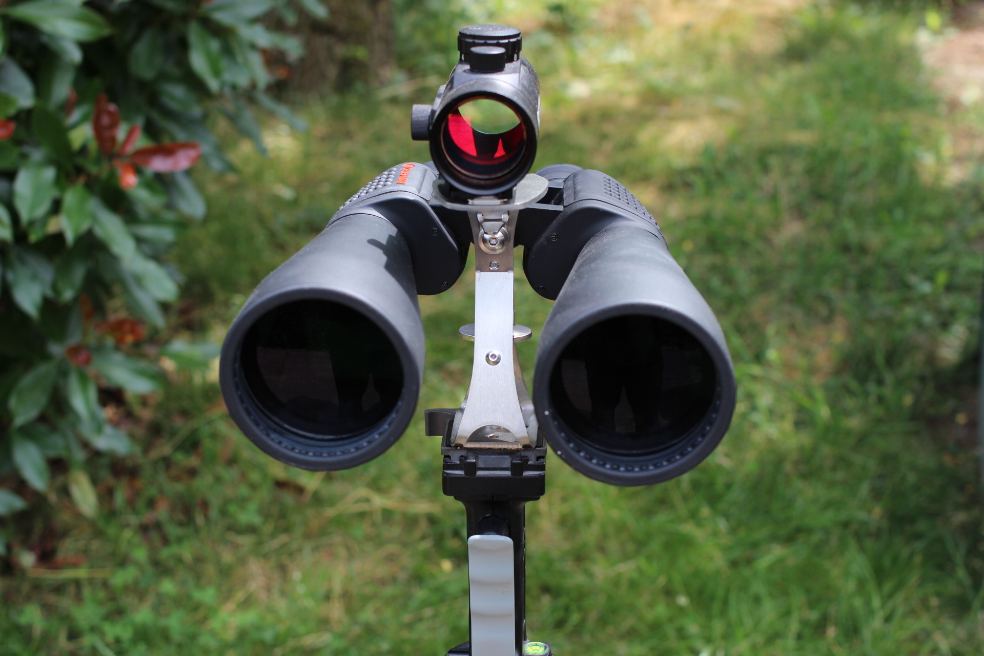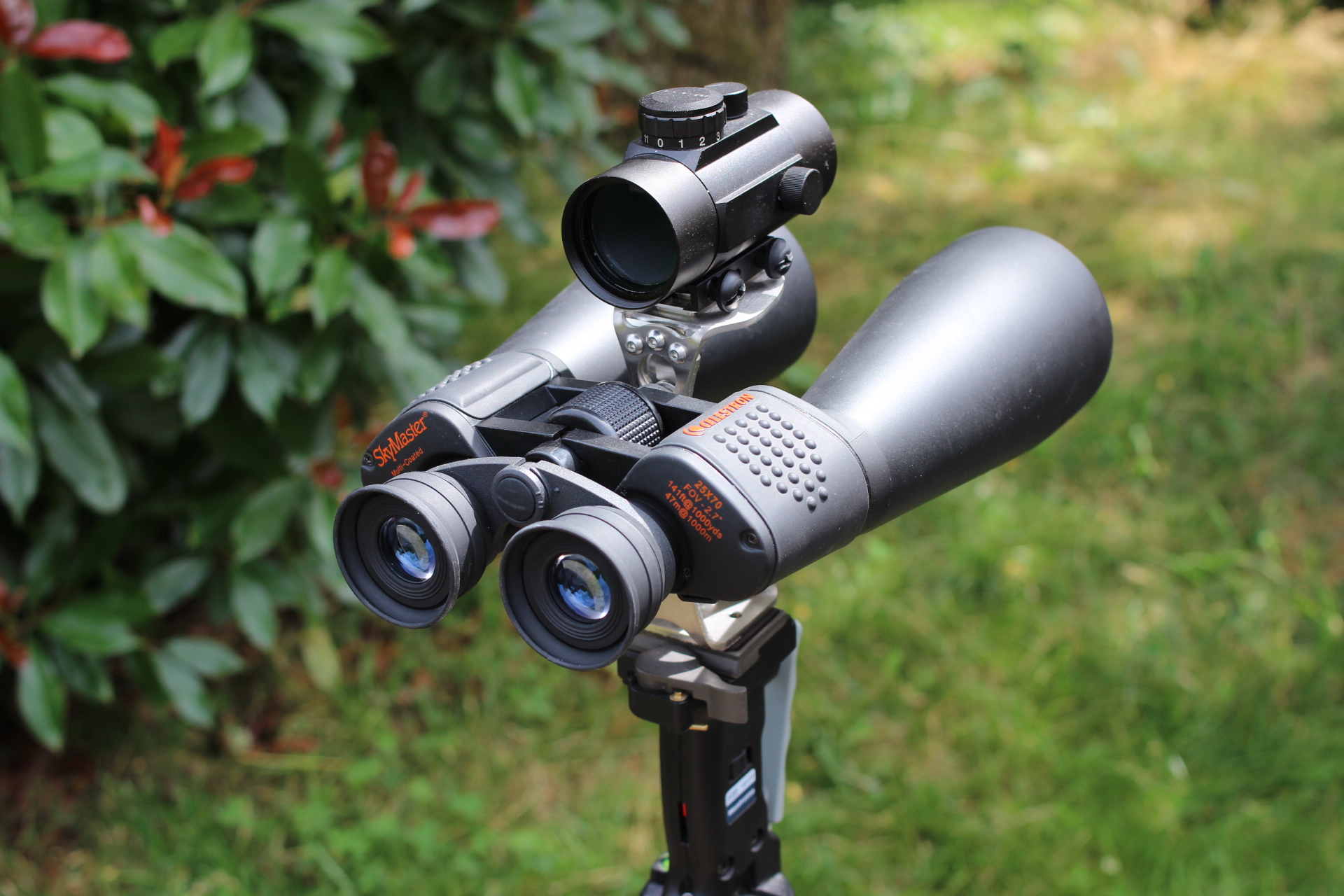 Pluspunkte sind das weitwinklige Bild mit 67° scheinbarem Gesichtsfeld und das vergleichsweise geringe Gewicht von knapp unter 1,5Kg. Den originalen Stativadapter haben wir durch den sehr guten FAR-Sight Fernglashalter der Firma Farpoint ersetzt. Der FAR-Sight Fernglashalter trägt das Celestron Skymaster sehr gut und ist auch mit der relativ hohen Vergrößerung von 25fach nicht überfordert. Der originale Stativadapter gehört ebenfalls zum Lieferumfang ist aber für dieses Fernglas praktisch unbrauchbar.