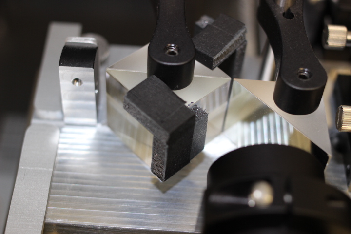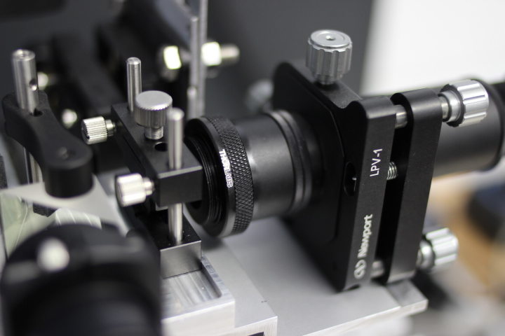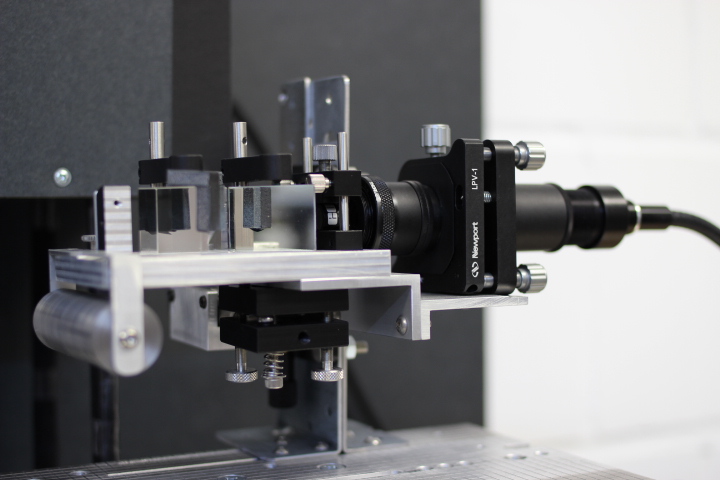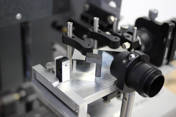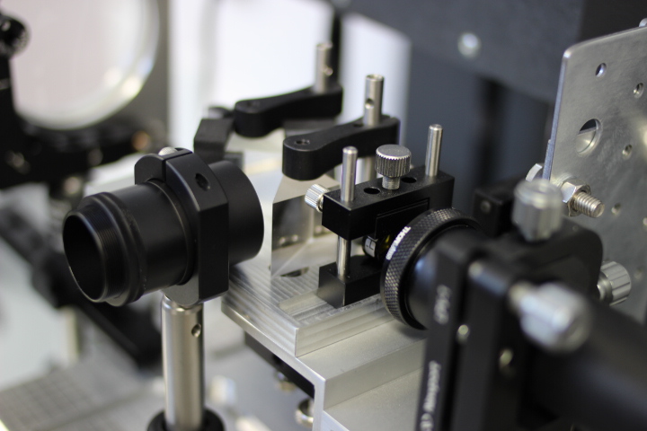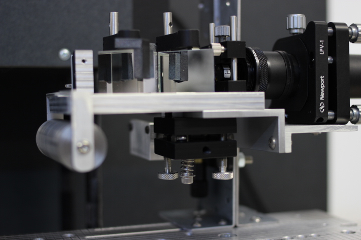 Die Beleuchtungseinheit sitzt auf einem Optikhalter der in 3 Richtungen linear bewegt und um zwei Ebenen gekippt werden kann. Damit wird eine exakte Ausrichtung des Beleuchtungsstrahls zum Interferometeraufbau möglich.