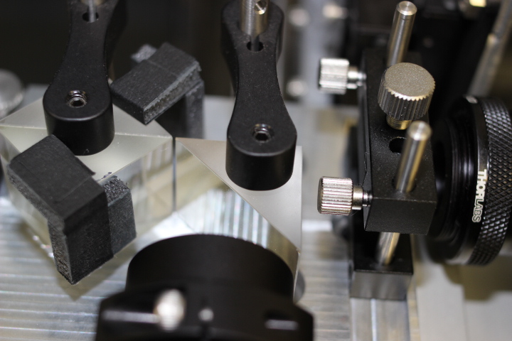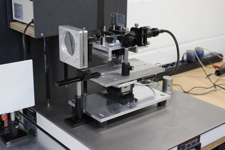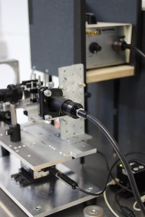 Um Messfehler durch Vibrationen wirksam zu unterdrücken steht der komplette Aufbau auf einer aktiv-schwingungsdämpfenden Plattform von Newport. Aktiv bedeutet, dass die 4 Schwingungsabsorber auf denen die Plattform steht, an ein Druckluftsystem mit konstantem Druck angeschlossen sind. Ein Absorberpaar und zwei einzelne Absorber können Ihren Luftdruck, also ihre Federung, voneinander unabhängig regulieren.