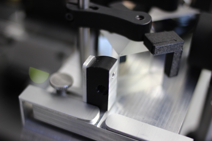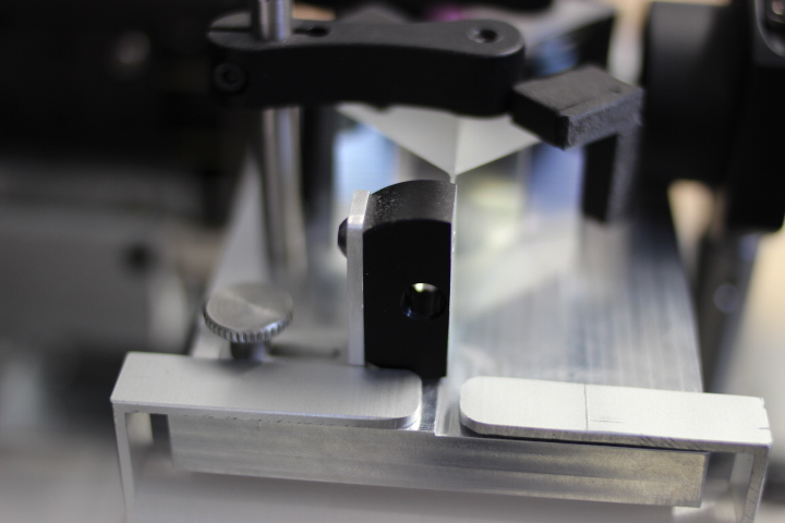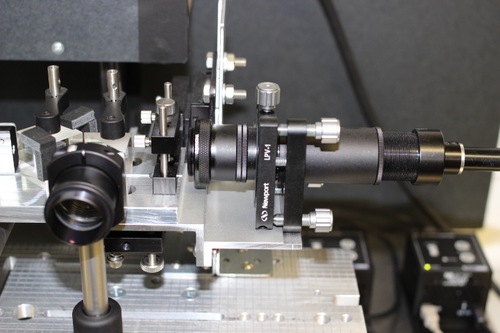 Zwischen verstellbarer Irisblende und dem Strahlteilerwürfel kann ein Filterhalter in den Strahlengang eingesetzt werden. Der Filterhalter kann während der Messung herausgenommen werden, um den Filter zu wechseln. Damit haben wir die Möglichkeit, Optiken ohne grosse Auswirkungen auf die Justage des Messaufbaus, bei engen Bandbreiten und unterschiedlicher Zentralwellenlänge der Beleuchtung, zu vermessen.