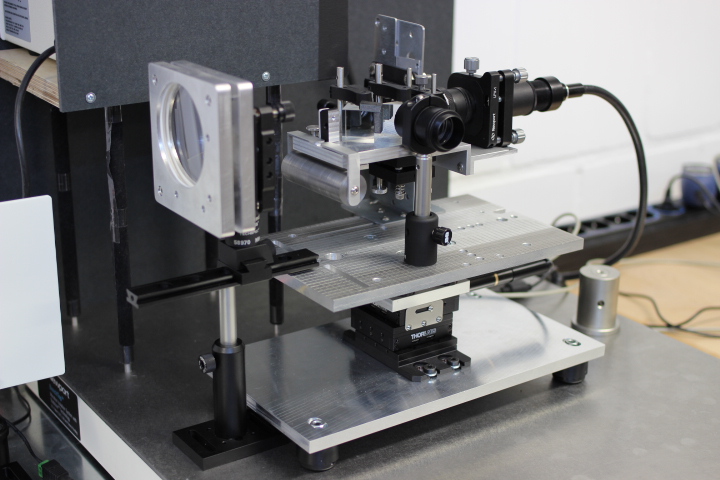Motorisch verstellbare Bühnen zur Verschiebung des Bath-Aufbaus in xy-Richtung dienen dazu, den Fokuspunkt des Interferogramms und die seitliche Ausrichtung zur zu prüfenden Optik genau einzustellen. Die beiden Bühnen sind von Thorlabs und werden durch Gleichstrommotoren angetrieben. Sie werden über Software gesteuert und erlauben Bewegungsauflösungen von 29nm bei einer gesammten Verfahrlänge von 12mm.