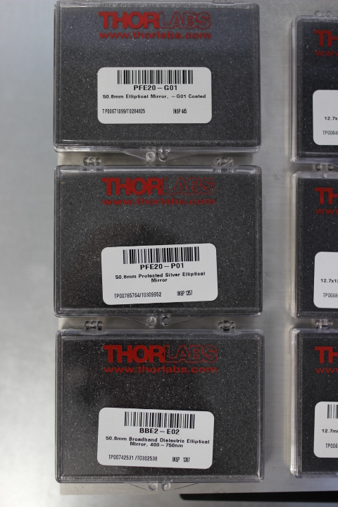 Die Reflektivität von Spiegeln ermitteln wir durch den Vergleich der gemessenen Reflexionsspektren mit Referenzspektren. Die Referenzspektren erhalten wir durch die Messung an Spiegeln bekannter Qualität. Wie im folgenden Bild zu sehen benutzen wir dazu 3 elliptische Planspiegel des Herstellers Thorlabs mit verschiedenen Beschichtungen, deren Reflexionsspektren veröffentlicht sind.