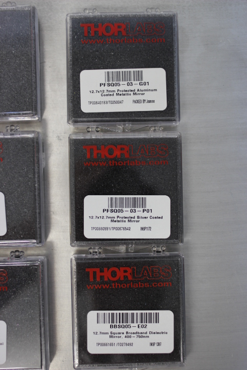 Im folgenden Bild sind die verwendeten quadratischen Referenzspiegel mit verschiedenen Beschichtungen zu sehen. Die Daten zur Reflexion der verschiedenen Beschichtungen sind auf der Website von Thorlabs veröffentlicht.