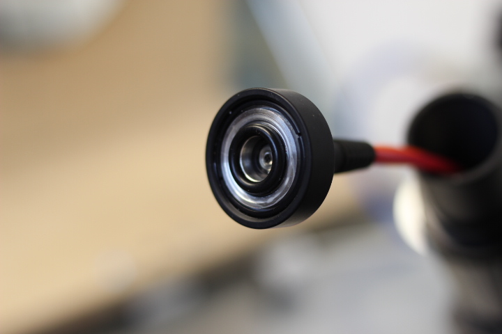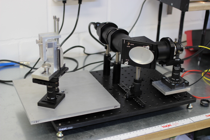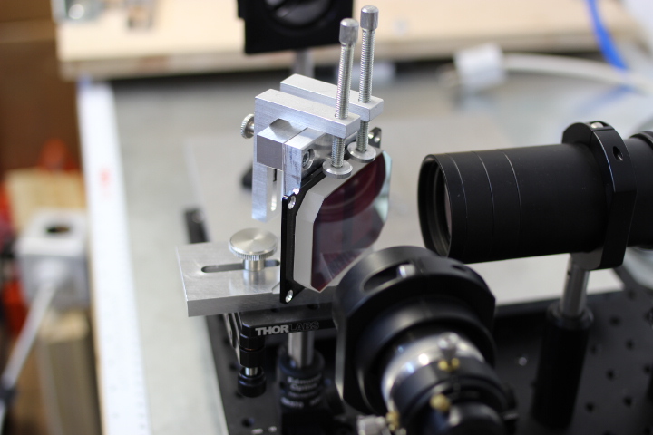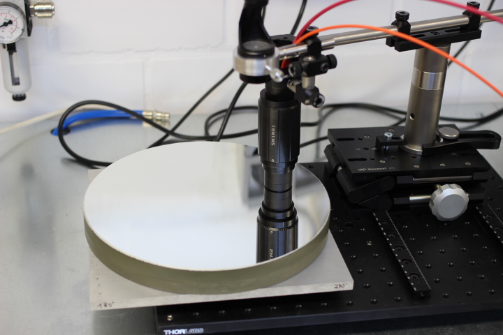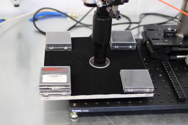 Die Sonde kann im beschriebenen Messaufbau sehr sicher, nah an der Prüfoberfläche positioniert werden. Im folgenden Bild ist die Reflexionsmessung am dielektrisch beschichteten, quadratischen Referenzspiegel von Thorlabs zu sehen.