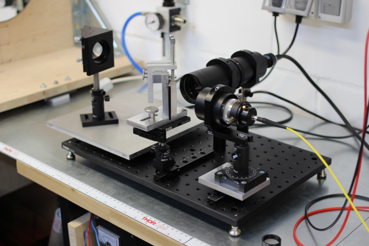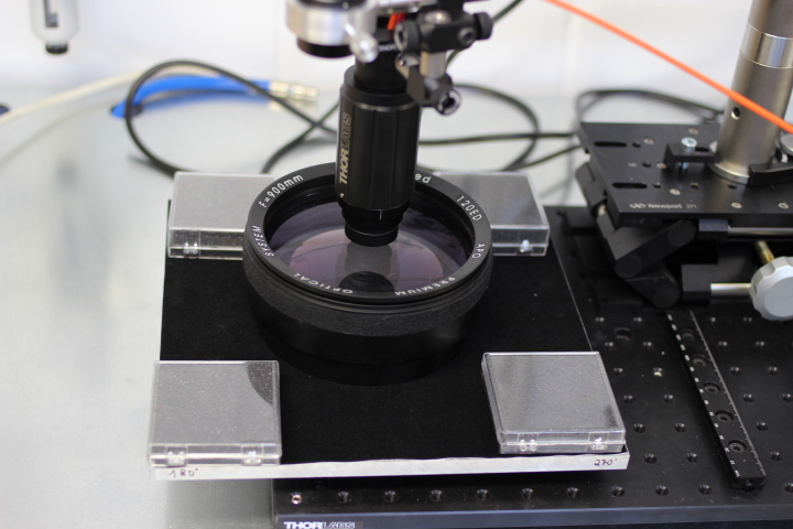 Das Strahlenbündel der Lichtquelle wird durch eine Lochblende im Fokus eines 2" Achromaten positioniert und dadurch kollimiert. Anschließend wird das kollimierte Strahlenbündel durch einen zweiten, gleichen Achromaten auf einen Lichtwellenleiter fokussiert. Nahe dem Ausgang der zweiten Linse wird der zu prüfende Spiegel positioniert, der das konvergierende Strahlenbündel auf den Lichtwellenleiter im gewümschten Winkel umlenkt.