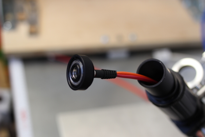 Im folgenden Bild ist die Trennung der Lichtwellenleiter der Reflexionssonde zu sehen. Das Kabel mit den Lichtwellenleitern zur Beleuchtung des Prüflings wird vom Lichtleiter der Kaltlichtquelle angestrahlt. Der Lichtwellenleiter zur Erfassung der Reflexion des Prüflings ist an das CCD-Spektrometer angeschlossen.