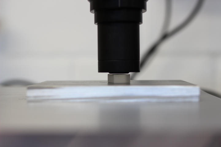 Die genaue Ausrichtung der Sonde zum Prüfung wird mittels Laserkollimator und verstellbarer Halterplattform sichergestellt. Der Laserkollimator ist vertikal genau zur Sonde ausgerichtet. Durch die Abbildung des vom Prüfling reflektierten Laserpunktes auf dem Lasertarget und Verkippung der Anordung mit den Verstellschrauben der Halterplattform können Prüfling und Sonde genau senkrecht zueinander ausgerichtet werden.