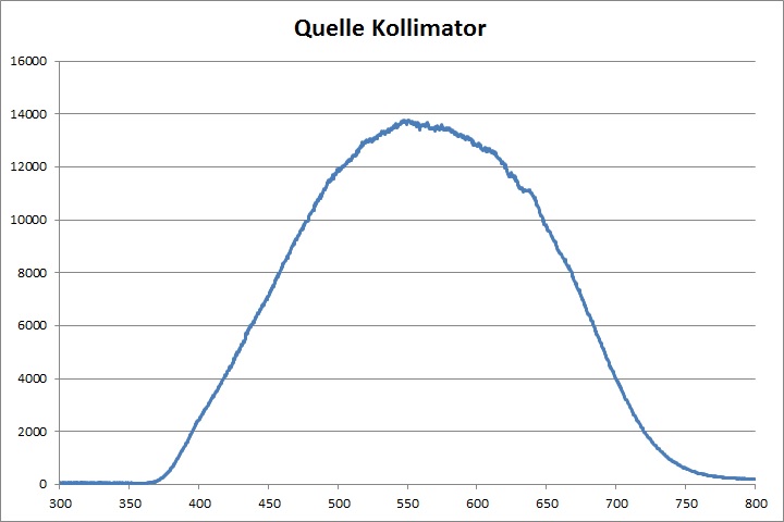Die Kaltlichtquelle strahlt im Bereich 350-800nm. Ihr Spektrum ist sehr homogen und verläuft im visuellen Bereich ähnlich dem Spektrum von Sternen (schwarze Strahler). Für genaue Reflexionsmessungen im visuellen Spektrum von 400-700nm kann die Kaltlichtquelle ausgezeichnet eingesetzt werden.