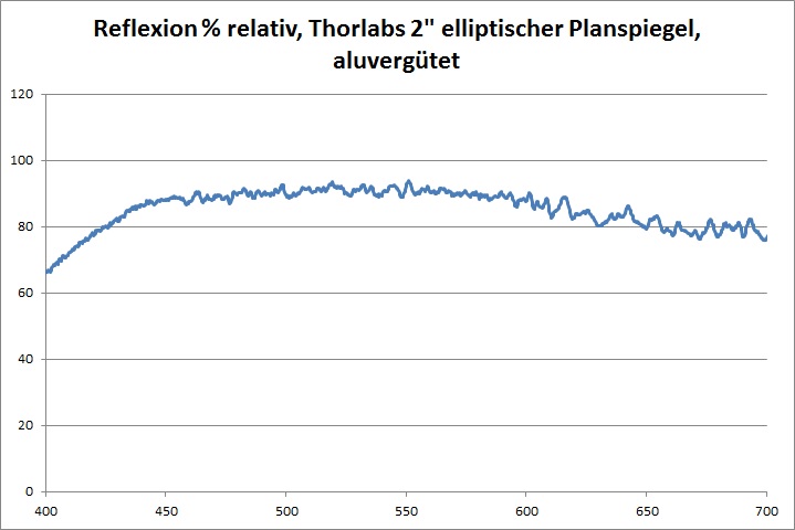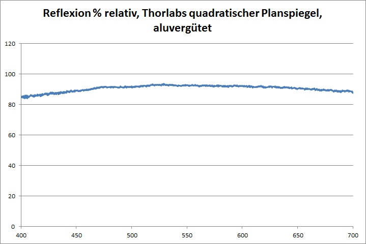 Die Reflektivität der Alubeschichtung zeigt den charakteristischen Verlauf einer solchen Beschichtung. Am unteren Ende des Spektrums ist die Reflektivität stärker geschwächt als am oberen Ende. In der Mitte des Spektrums liegt die Reflektivität im Bereich 90-92% relativ zur Quelle.