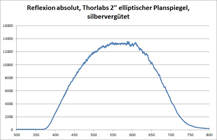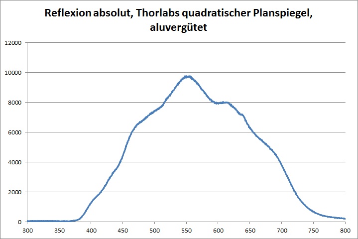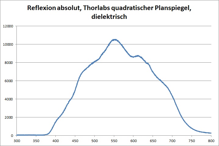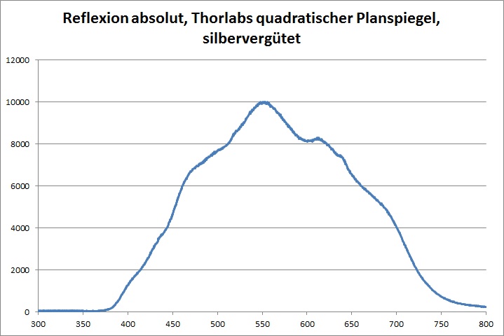 Relativ zum dielektrisch beschichteten Referenzspiegel zeigt der silber beschichtete Referenzspiegel bis 450nm eine deutlich verringerte Intensität der Reflexion. Am oberen Ende des Spektrums, ab etwa 625nm, fällt der Spiegel ein wenig ab. Die Kurven geben die Verhältnisse bei den von Thorlabs veröffentlichten Daten zur Reflektivität der Spiegel gut wieder.