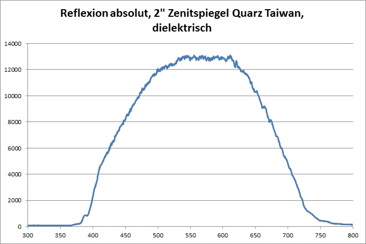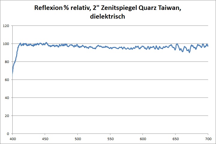 Das Reflexionsspektrum des dielektrisch beschichteten Quarz Zenitspiegels zeigt lediglich am unteren Ende des visuellen Spektrums die gleichen Einbrüche der Reflektivität. Das Intensitätsniveau fällt im Vergleich zur dielektrisch beschichteten Referenz nur leicht ab. Beim Blick in den Spiegel ist nicht mehr Streulicht als bei der Referenz zu erkennen.