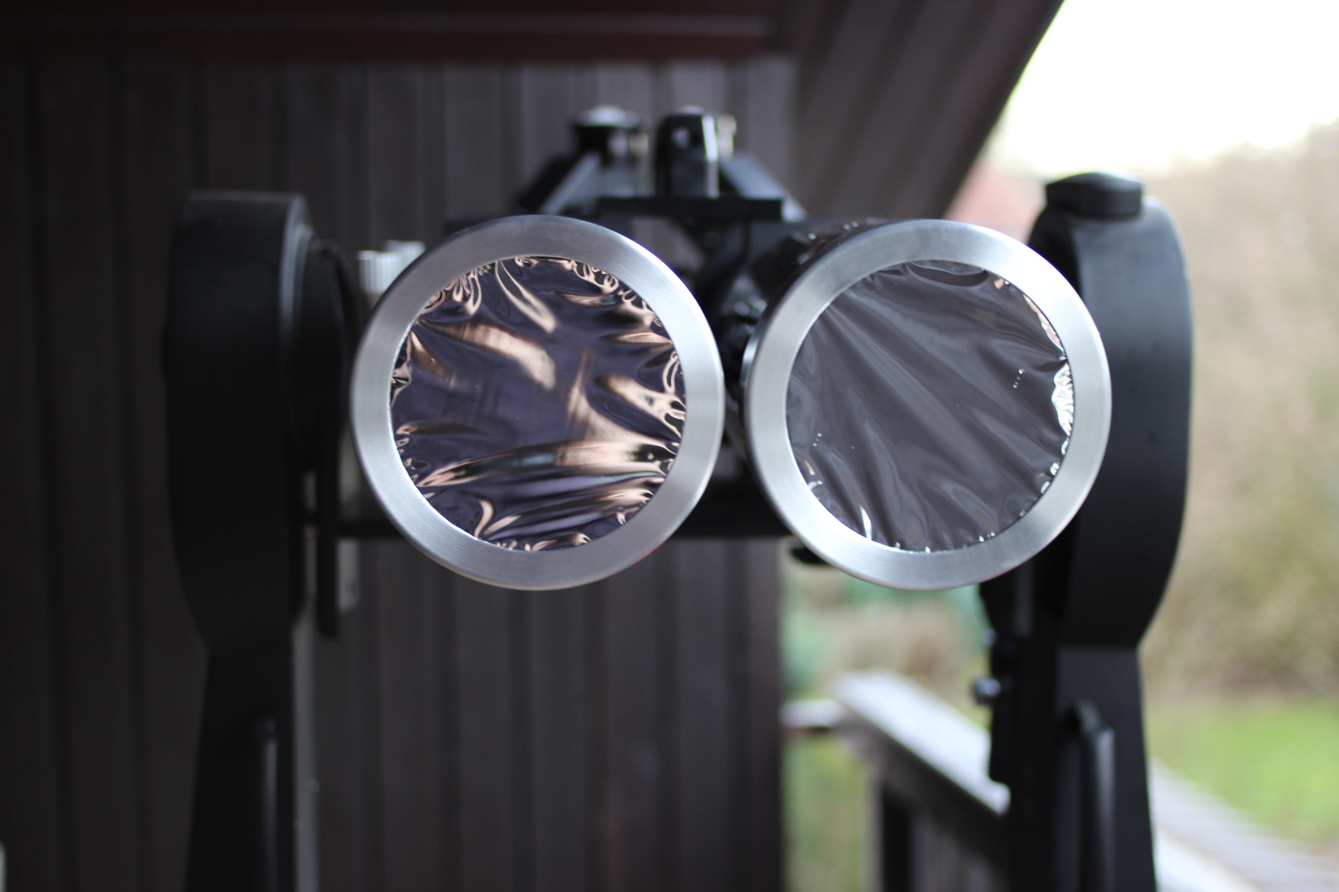 Zum Angebot gehören auch 2 passend angefertigte Sonnenfilter in Aluminiumrahmen. Die Filter bestehen aus visueller Sonnenfilterfolie von Baader und werden über die Taukappen geschoben. Sie sitzen dort sehr fest, sodass eine sichere Beobachtung der Sonne möglich wird.