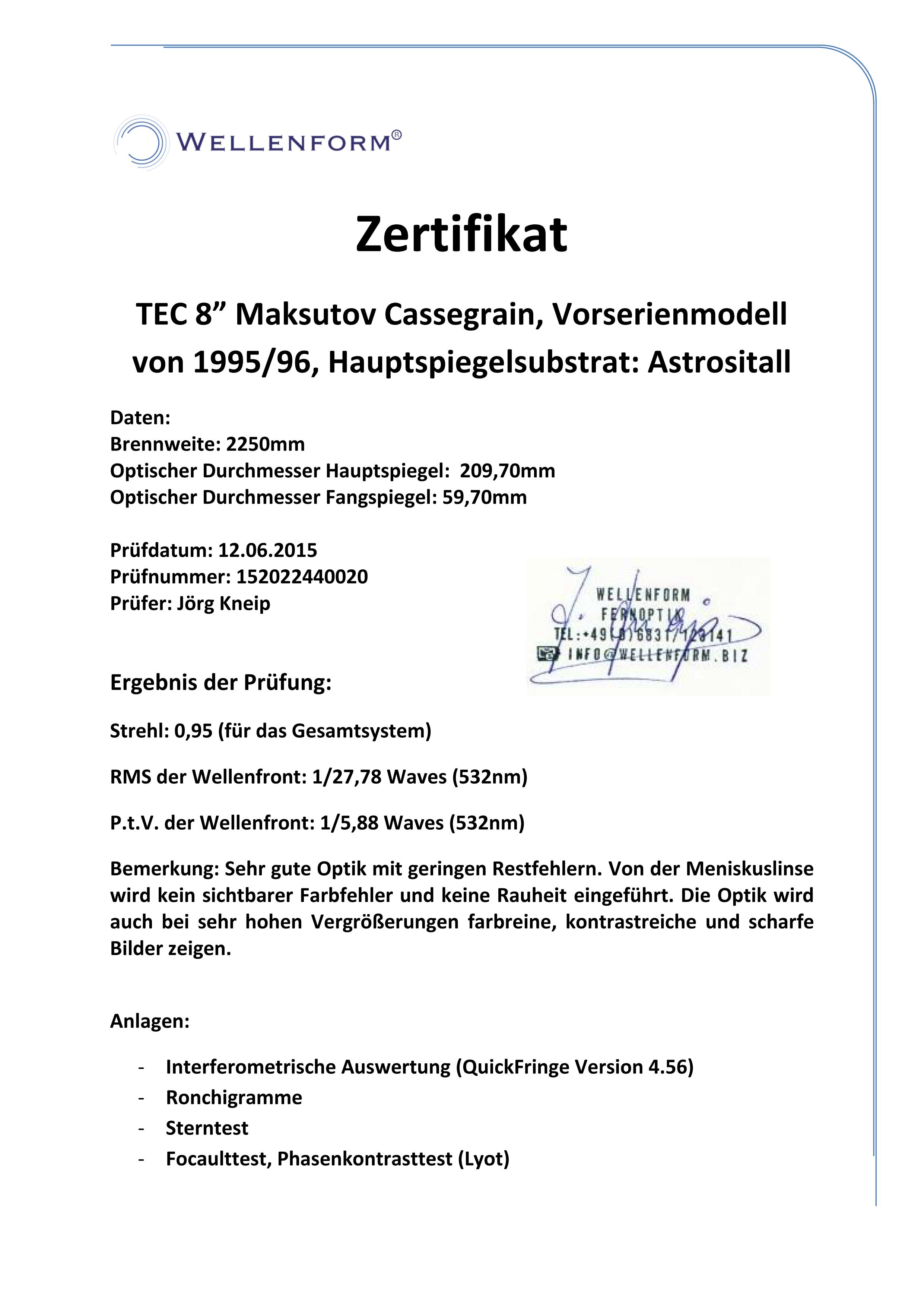 Die Optik wurde auf Wunsch des Kunden vor dem Verkauf von uns zertifiziert. Wir verkaufen den TEC Maksutov im Kundenauftrag.